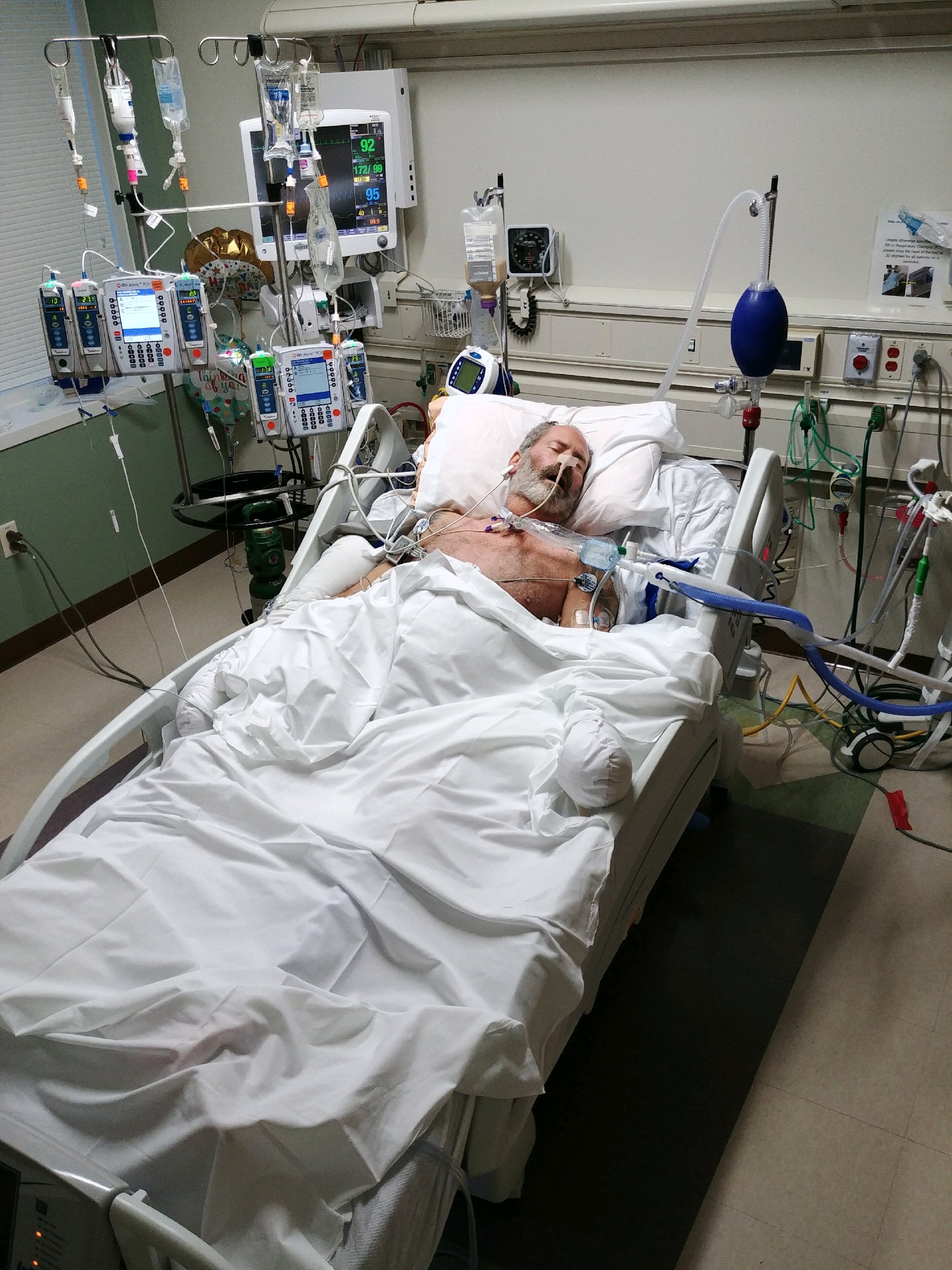 There was a moment while I was heavily sedated, I believe it was September 4, when I had an unusual clarity of mind.  During this time, I came to realize how long I had been in the ICU and how long I had been on the vent and that I was getting worse, not better.  Not knowing that everyone believed that I was almost certainly going to die, I came to that realization myself.  In fact, I had gotten to my breaking point where I told God that he needed to end this somehow very soon, because I couldn’t take the suffering any longer.  I needed it to end very soon and was making peace with the fact that I would die soon.  But then I became overwhelmed with deep sadness.