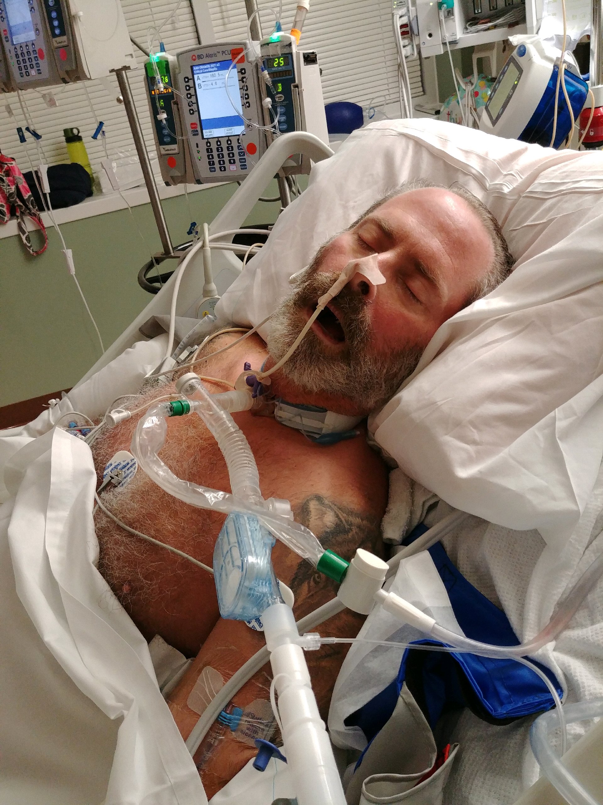 I was admitted as an ICU patient to the back up ICU unit.  The next day, August 4, I was moved into the real ICU and prepped with an arterial line and PICC line then intubated and placed on the ventilator.  I was supposed to be on the vent for 3 full days, but on August 6, despite being sedated and in wrist restraints, I unknowingly wiggled down in my bed, grabbed onto the endotracheal tube and pulled it out.  I have a vague memory of sitting up quickly in my bed gasping to try to breathe while several people ran into my room in a panic.  I was then placed on a bipap mask with forced oxygen therapy for the next 4 days to try to keep my O2 saturation above 90%.