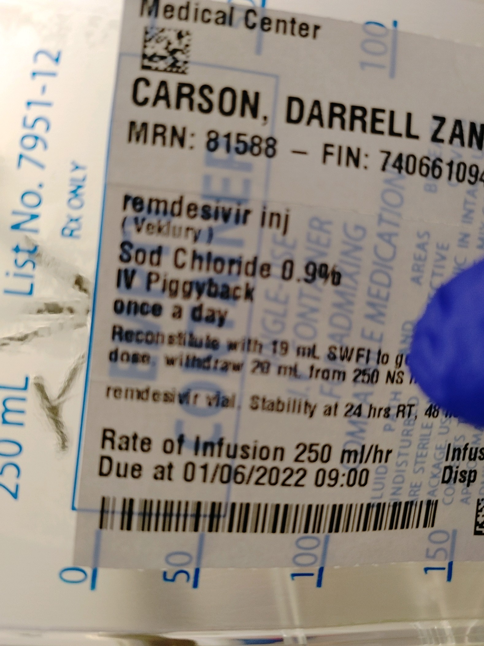 On January 1, 2022, he went to Round Rock Medical Center.  He stayed maybe a day and then was transferred to Ascension Seton Hospital in Downtown Austin, Texas. There, he began his Remdesivir treatment. He had between 4 – 6 doses of it.  We know of four (4) and think there might have been two (2) more administered; we are waiting on the records. Why are we waiting on the records, you ask?  Round Rock sent us their medical records, upon request.  Seton sent back the check that was sent to pay for the records, and said they couldn’t release them. I will be working on getting the records vigorously in the near future.