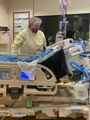 Once introduced to the BiPAP machine they immediately wanted to cut my visiting hours saying that the BiPAP was just shooting Covid all over the room and that I would just get reinfected. Somehow I managed to convince a nurse to allow me to continue to visit taking on the responsibility of getting sick again. With the BiPAP mask on, my mom was unable to cough and was having to remove it to cough. She was very thirsty and would remove it so that I can help her take a drink, mind you, I was helping her take drinks. Rarely did nurses come in except to check machine numbers or whatever, rarely to care for her.