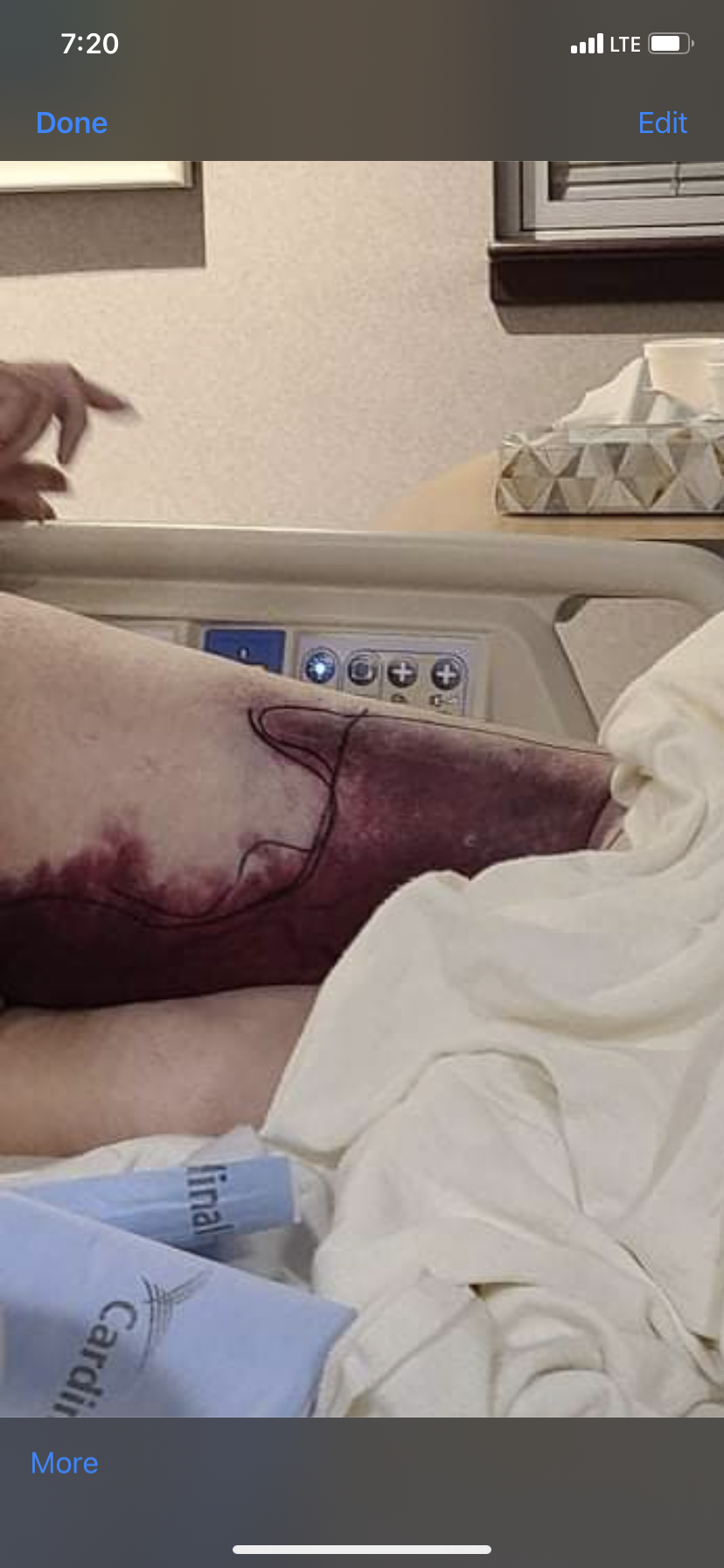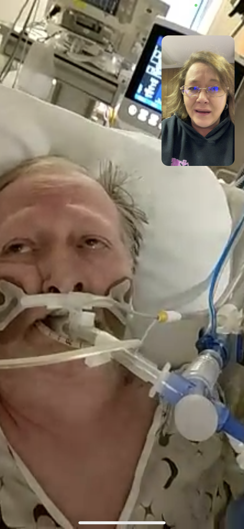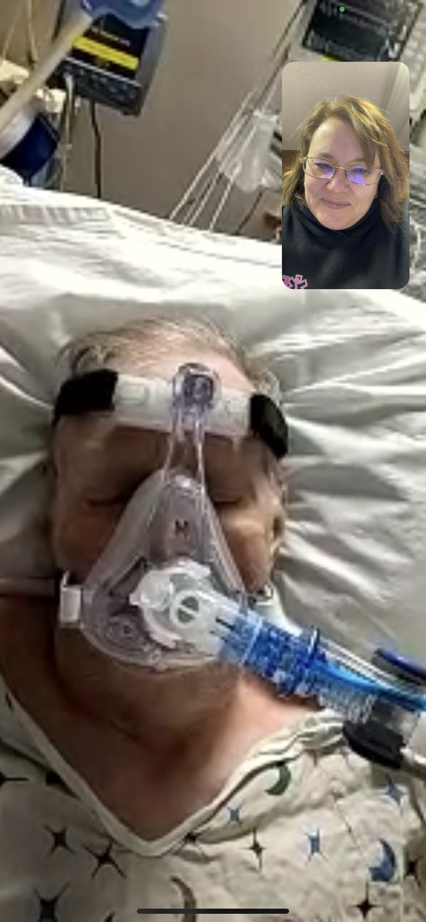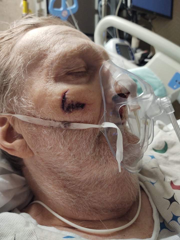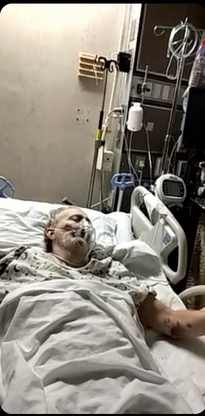 November 25th – no injuries as my sister was able to see him. Then he was isolated until December 3,  at which time, my sister went to see him and he had a laceration on his face.  He was in shock and the nurse was more worried about why my sister was there, and why I was video chatting to watch.  His vitals were tanking and she kept saying it was baseline.  It took 3 hours of demanding a doctor to come and see him, before I got a call.  They asked why I needed to speak to a doctor; who finally came to check on him, called me back and said they were moving him back to CCU, because he was in septic shock.  When asked about the laceration on his face,  they said it was from when he was on the vent. I have photo proof that he did not have it on November 25th after he was woken from being on the vent.